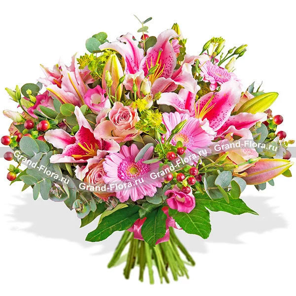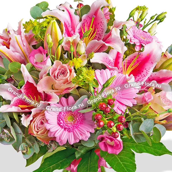 Стандартный: лилия розовая - 2 шт., роза розовая - 5 шт., гербера розовая - 4 шт., эустома розовая - 3 шт., гиперикум красный - 3 шт., эвкалипт - 3 шт., рускус - 3 шт., бант розовый.