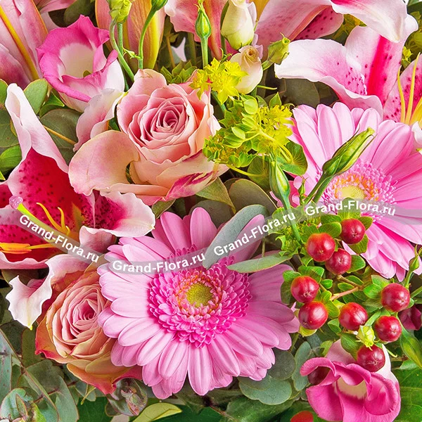 ДЕЛЮКС: лилия розовая - 5 шт., роза розовая - 11 шт., гербера розовая - 7 шт., эустома розовая - 4 шт., гиперикум красный - 5 шт., эвкалипт - 5 шт., рускус - 5 шт., бант розовый.