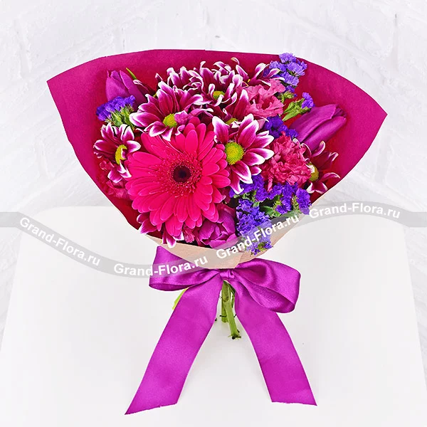 Уменьшенный: гербера малиновая - 1 шт., тюльпан фиолетовый - 3 шт., хризантема кустовая фиолетовая - 2 шт., эустома розовая - 1 шт., статица., упаковка, лента. Примерный размер: 25Х25 см.