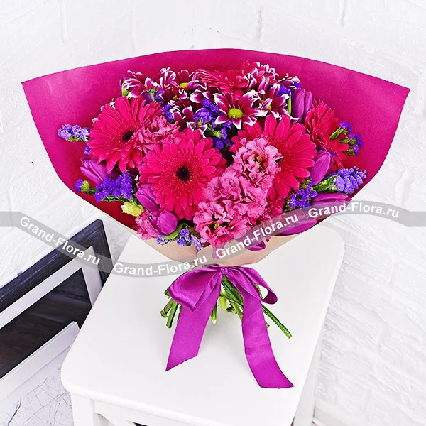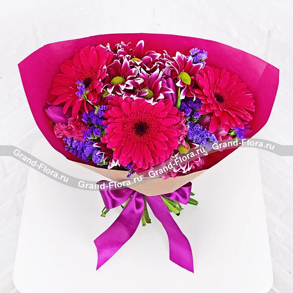 Люкс: гербера малиновая - 5 шт., тюльпан фиолетовый - 10 шт., хризантема кустовая фиолетовая - 4 шт., эустома розовая - 4 шт., статица., упаковка, лента. Примерный размер: 40Х40 см.
